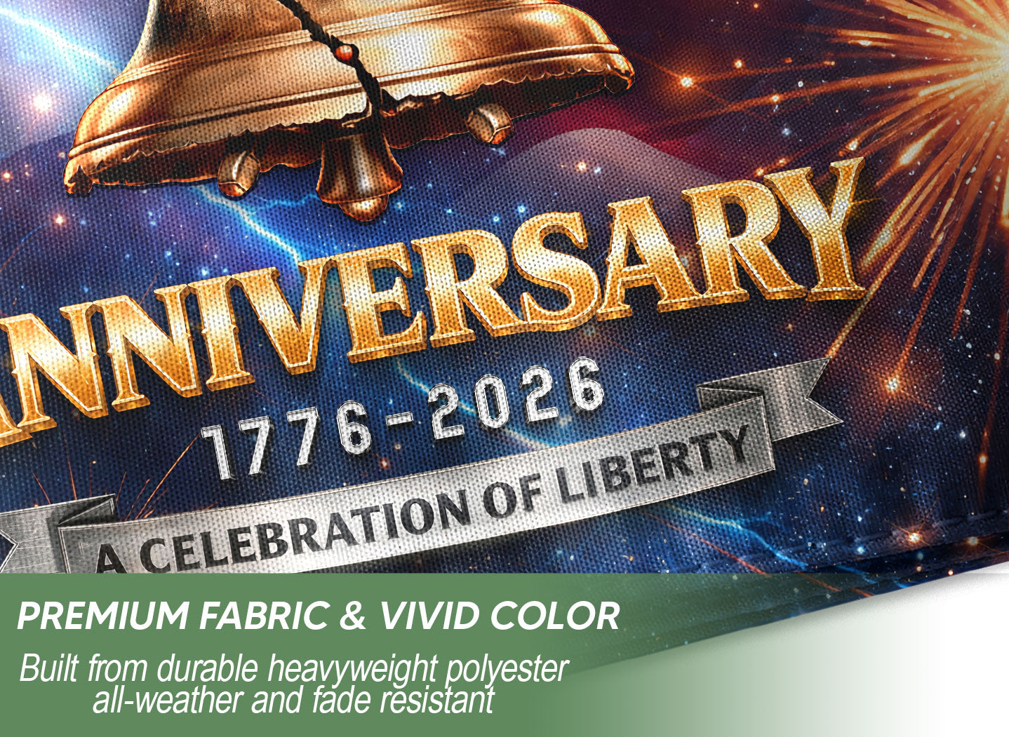 Showcasing the iconic Liberty Bell alongside a fierce bald eagle and lightning-inspired fireworks, this double-sided garden flag symbolizes enduring liberty and the powerful spirit of America’s 250-year journey.