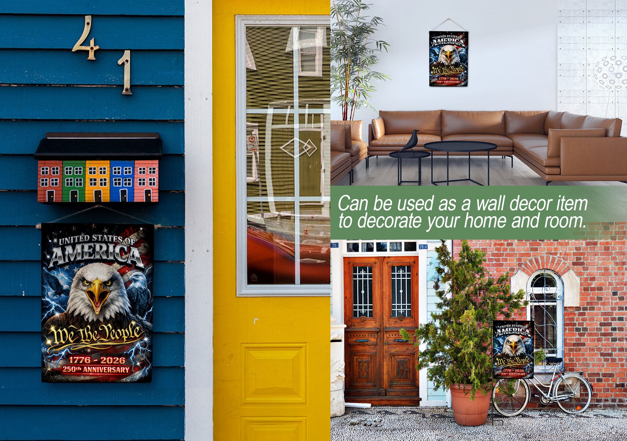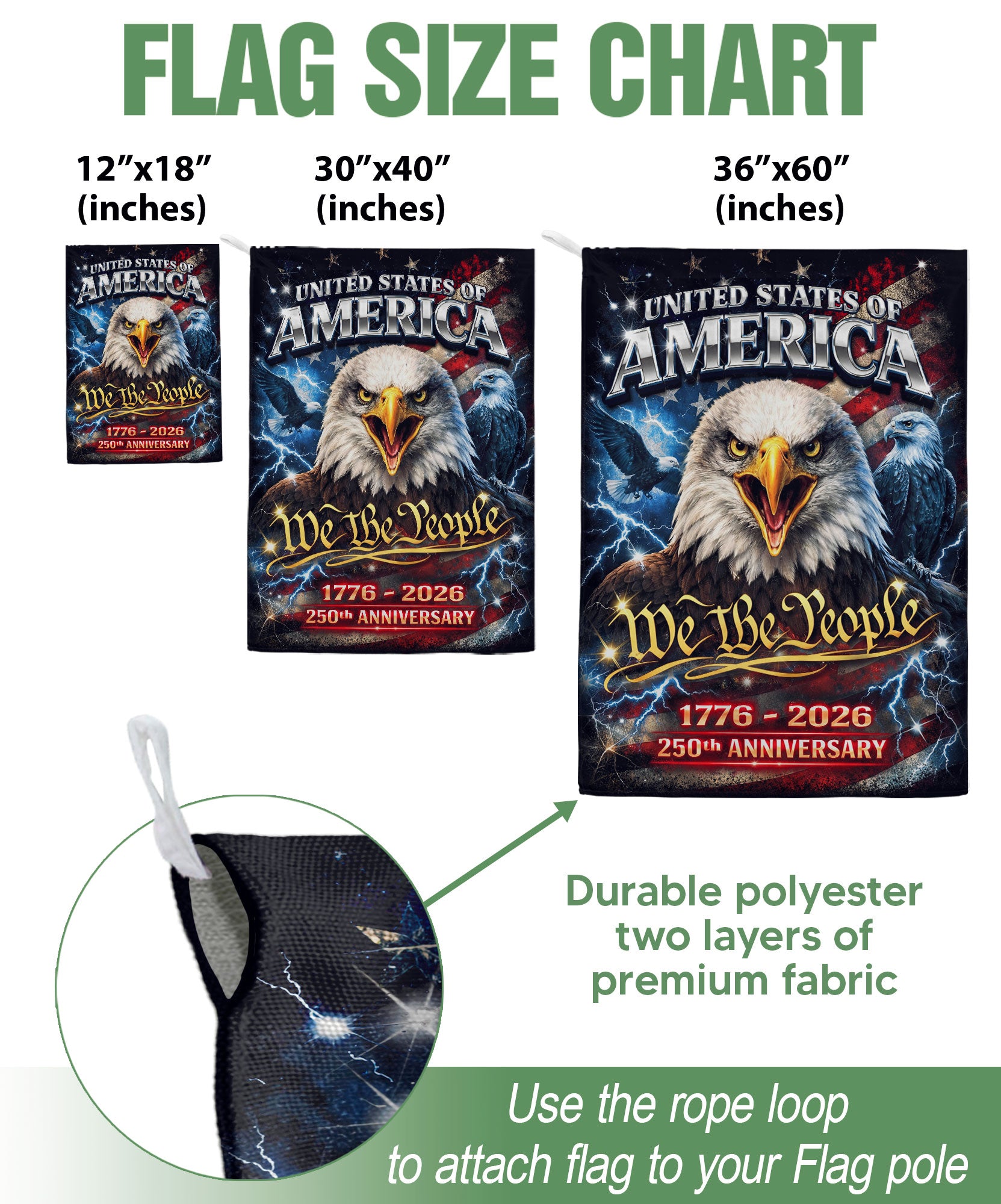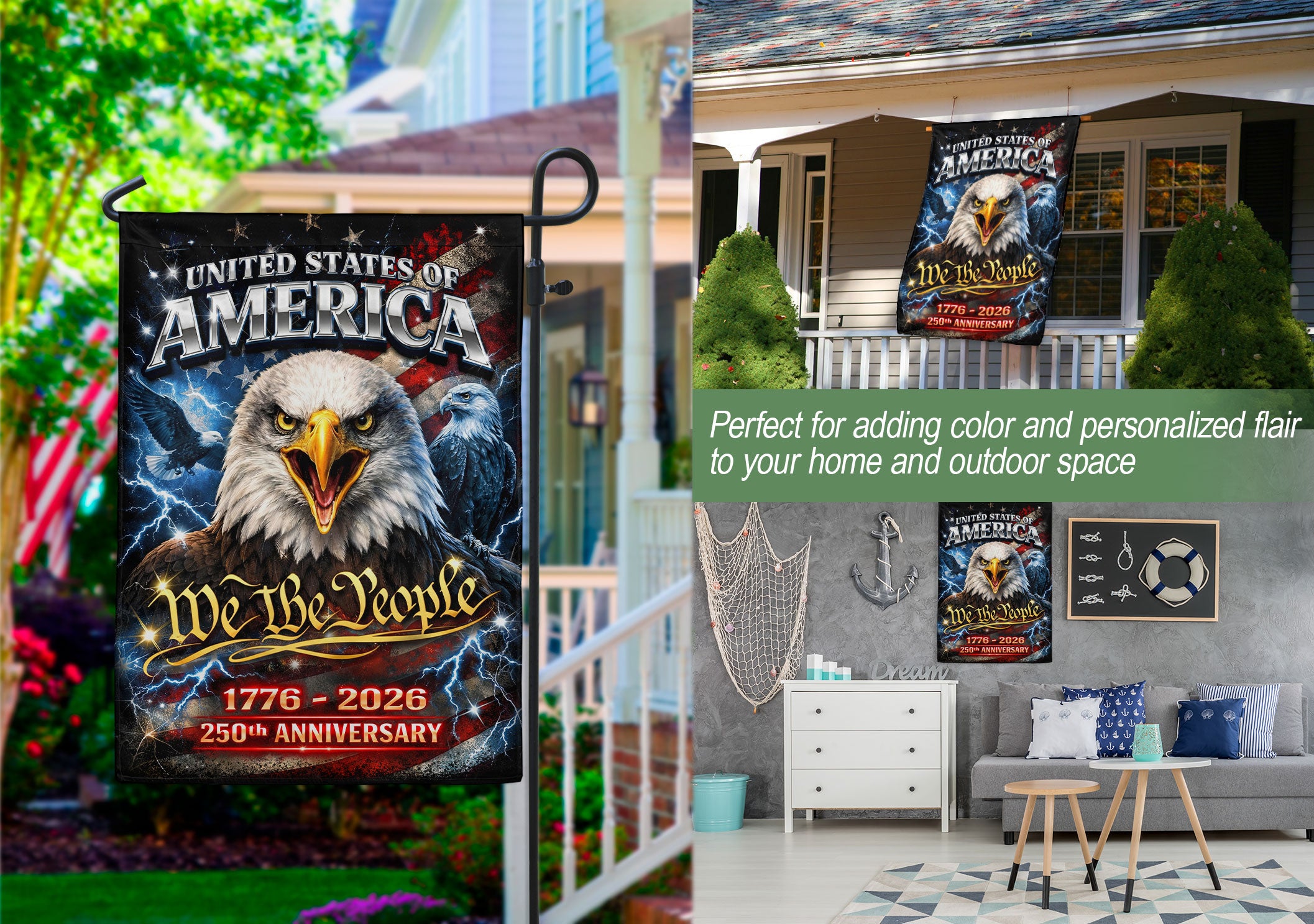 Featuring "We The People" alongside a powerful eagle graphic, this double-sided garden flag commemorates 1776–2026 and honors the enduring spirit of freedom, resilience, and national pride. A meaningful outdoor display to celebrate America’s 250th anniversary milestone in your yard, porch, or garden.