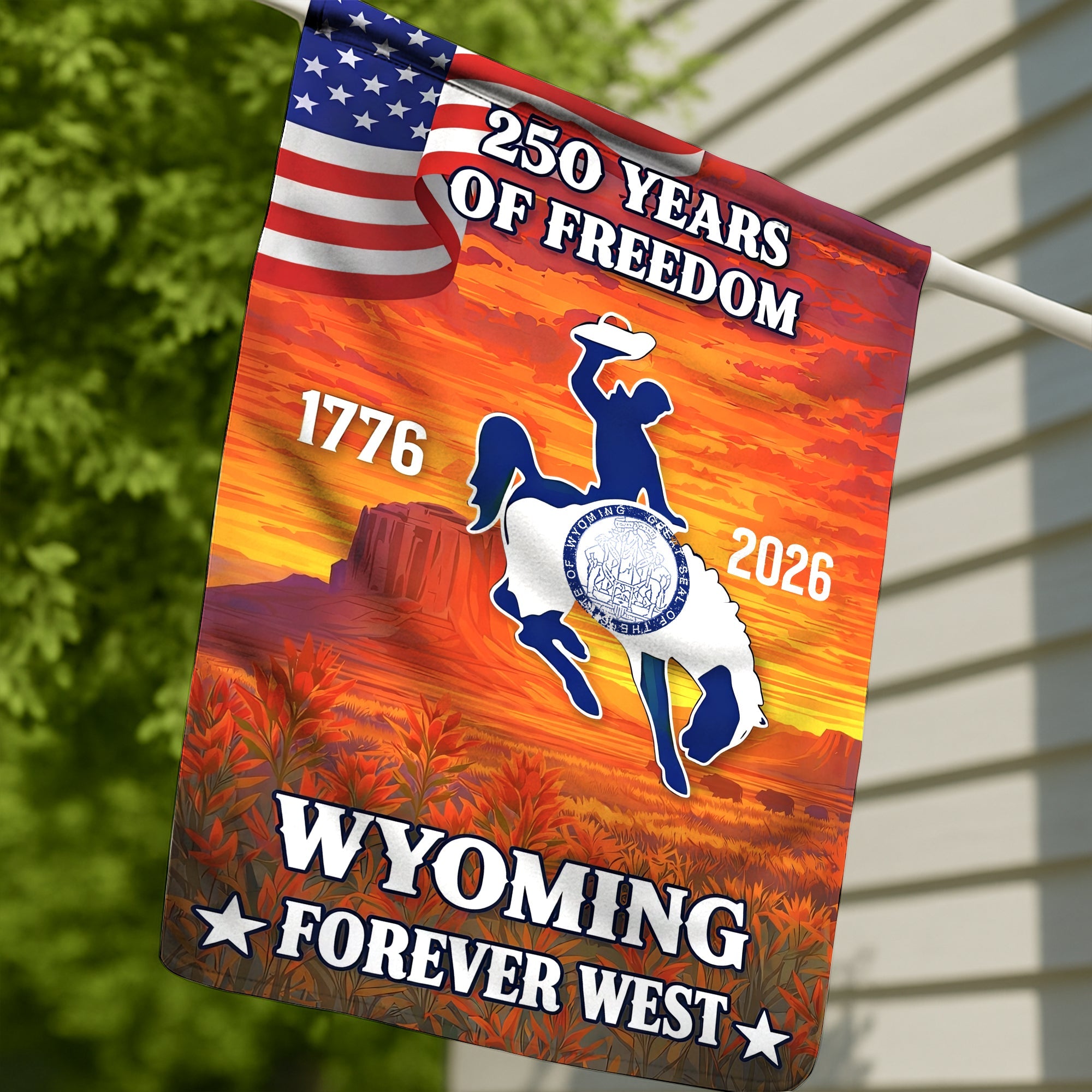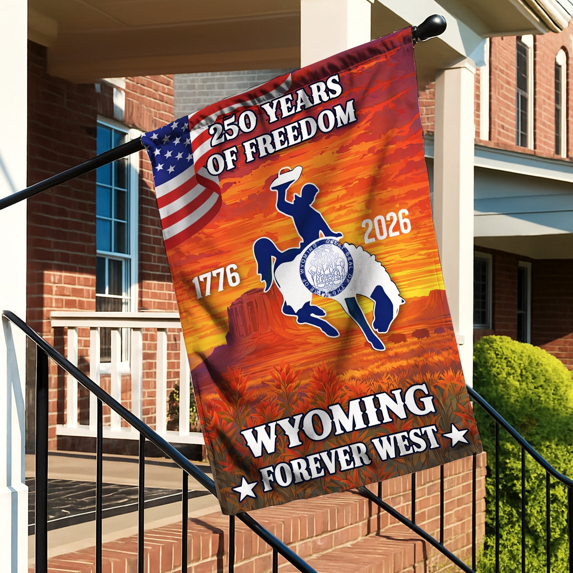 Celebrate 250 Years of Freedom with this bold Wyoming Forever West patriotic flag, featuring a striking rodeo rider silhouette, American flag accents, and the 1776鈥?026 tribute. Designed in vibrant sunset tones inspired by the Western landscape, this flag makes a proud statement for Independence Day and beyond. Available in both garden flag and house flag sizes, it鈥檚 perfect for front yards, porches, ranch homes, and patriotic outdoor d茅cor that honors Wyoming heritage and American freedom.
